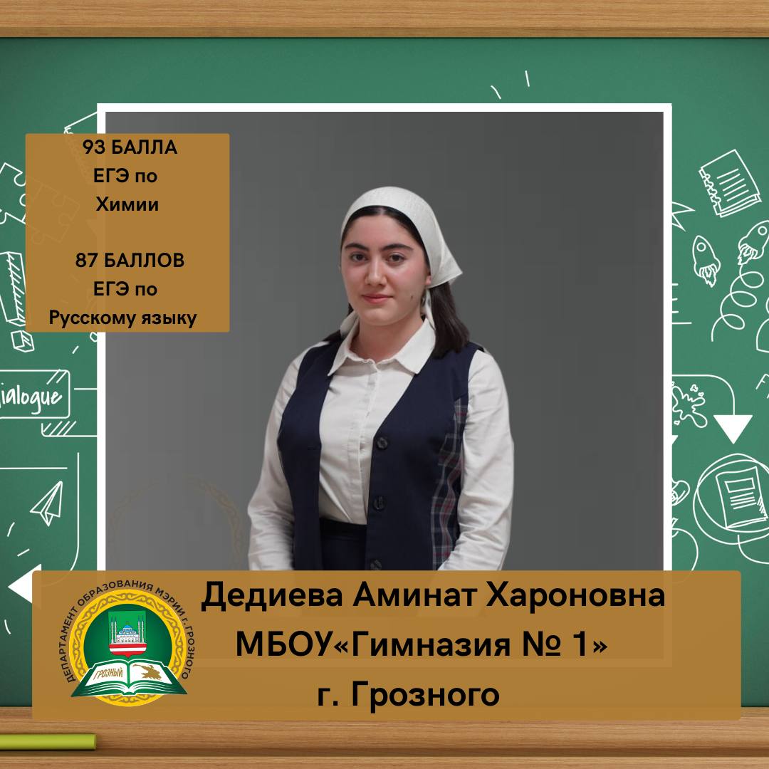 17.07.2023У нас замечательные новости! Аминат Хароновна Дедиева, ученица МБОУ «Гимназия № 1» г. Грозного, набрала на ЕГЭ 93 балла по химии и 87 баллов по русскому языку. «Моя подготовка к ЕГЭ началась еще в 10 классе, и я безумно рада возможности заниматься с такими прекрасными учителями, как Фатима Магомедовна Кадырова и Хамсат Магомедовна Насуева. Их профессионализм и преданность своему делу существенно повлияли на мой успех, за что я им искренне благодарна. В 11 классе я решила перейти на онлайн-обучение по русскому языку, которое проводилось Анной Александровной Солдаевой, одним из лучших учителей России. Это решение сыграло значительную роль в моей подготовке к ЕГЭ по данному предмету. По химии, в отличие от других предметов, у меня не было репетитора, который контролировал бы мои занятия, и это стало для меня вызовом. Несмотря на наличие всех необходимых видеоматериалов, я осознавала, что мне нужно вложить больше усилий и времени в подготовку к экзамену по этому предмету. Подготовка к ЕГЭ - это сложный и ответственный процесс, который требует полной отдачи. Чем больше времени, стараний и внимания вы вкладываете в подготовку, тем выше вероятность успешной сдачи экзаменов»,- прокомментировала свой успех наша высокобалльница. Дала тlаьхье беркате йойла! #ЕГЭ2023 #ГИА11 #стобалльник #высокобалльникиГрозного2023 #русскийязык #химия #ГПН_2023 #ГодПедагогаНаставника #ГодПедагогаНаставникавЧР #УчитьВдохновлятьРазвивать2023 #Выпуск23МарафонПобед #школьникиГрозного #системаобразованияГрозного #ЗелимханАхматов #ДепобрГрозный