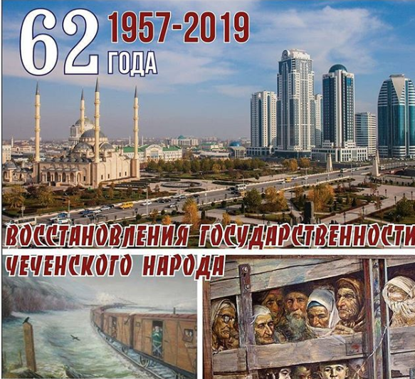 62 года прошло со дня издания Указа Президиума Верховного Совета о восстановлении Чечено-Ингушской АССР, благодаря чему чеченский народ был социально реабилитирован и восстановлен во всех правах. Годы депортации были трагическими для чеченского народа, который тринадцать лет провел в Сибири и Средней Азии. За этот непростой период чеченцы прошли через множество лишений и тягот. Процесс реабилитации затянулся на многие десятилетия. Долгожданное возвращение народа, восстановление ЧИАССР стало поистине осуществлением заветной мечты наших предков. Это событие явилось окончанием тяжелейшего периода депортации, символом торжества исторической справедливости. Несмотря на все трудности, чеченский народ проявил терпение и стойкость, сохранил культуру и традиции, честь и достоинство.Сегодня Чеченская Республика, руководимая ГЛАВОЙ ЧЕЧЕНСКОЙ РЕСПУБЛИКИ, ГЕРОЕМ РОССИИ РАМЗАНОМ АХМАТОВИЧЕМ КАДЫРОВЫМ, являясь равноправным субъектом Российской Федерации, сумела добиться внушительных успехов в различных сферах жизнедеятельности, здесь созданы все условия для нормальной и созидательной жизни.Искренне поздравляю всех с Днем восстановления государственности чеченского народа, желаю мира, стабильности и процветания! Дала т1аьхье беркате йойла!
